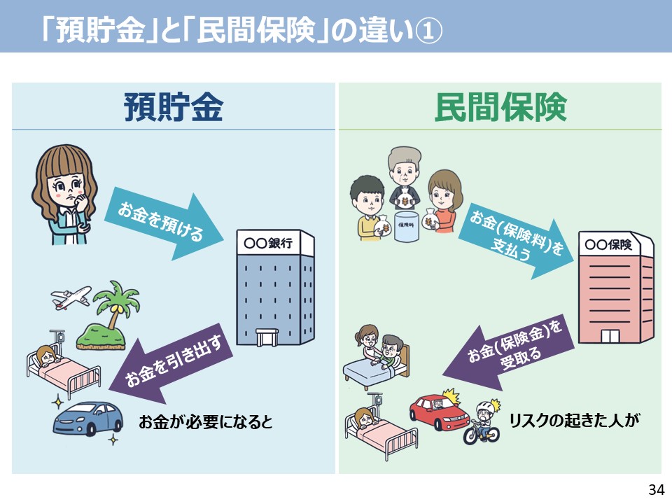 | 展開④ | 4.「預貯金」と「民間保険」の違いって何だろう? ・自助の代表的な手段である「預貯金」と「民間保険」について、そのしくみと特徴を理解する ・データを用いて「生命保険」の特徴や種類について学ぶ |