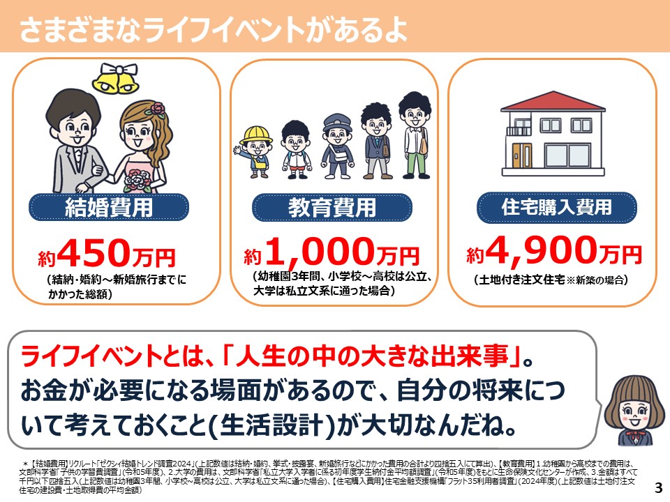 「足の骨折で入院した場合」の事例やクイズを通して、不測の事態に備える必要性や、備える方法(社会保険、預貯金、生命保険等)について学ぶことができます。