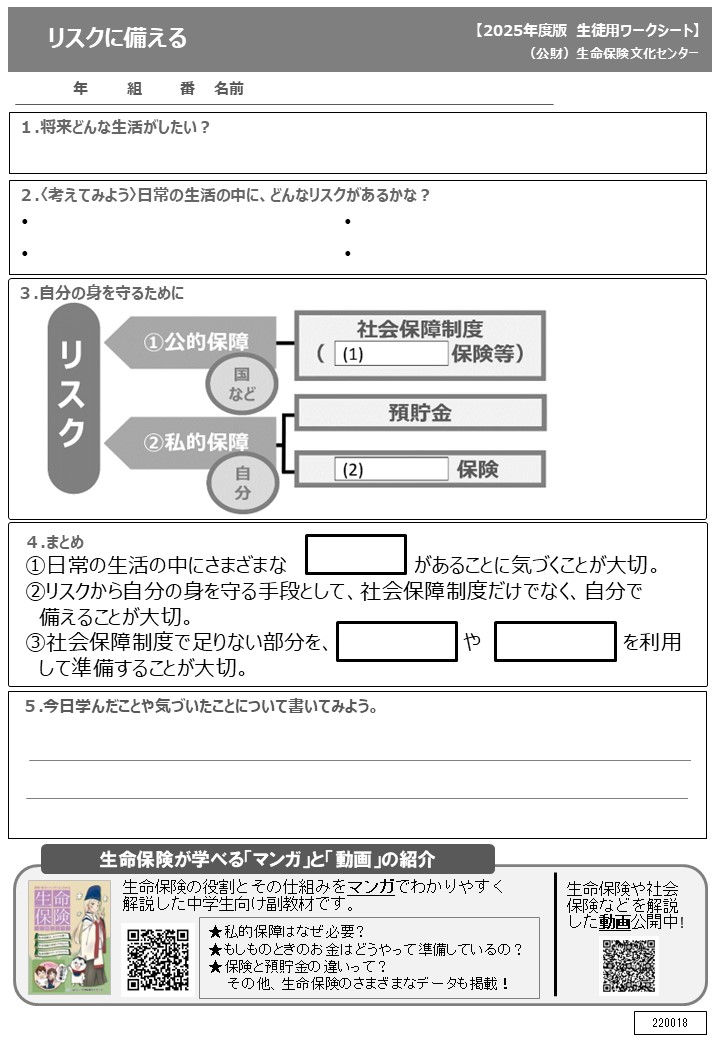 | 展開① | 2.リスクって何? 身の回りにあるリスクについてクイズを交えながら学び、リスクに備える方法として公的保障と私的保障について学ぶ |