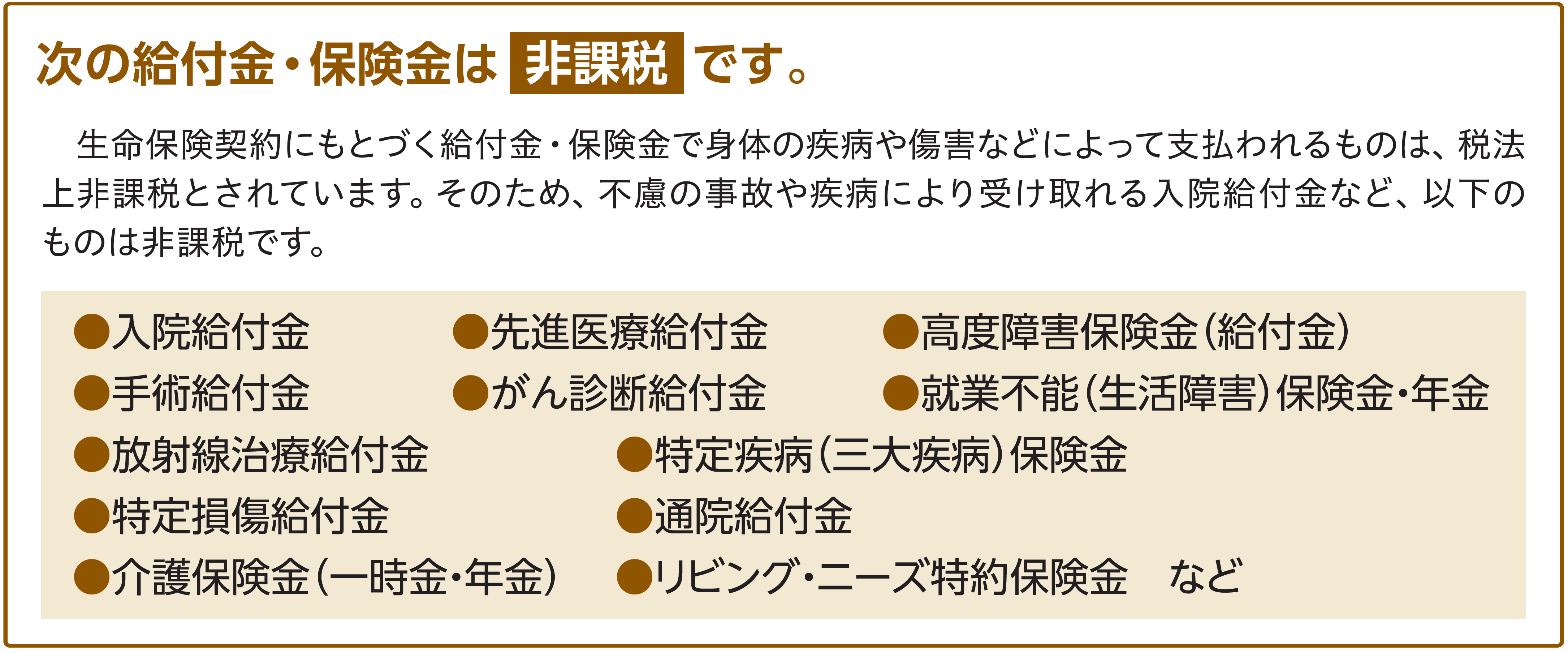 - 生前に受け取った上記の入院給付金などを被保険者が使い残して死亡した場合、残った給付金部分は相続財産として相続税の課税対象となり、死亡保険金の非課税の適用はありません。