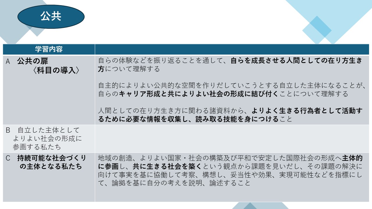 公共においては、教科目標の実現を見通した教育の観点から、特別活動などと連携し、自立した主体として社会に参画する力を育む中核的な機能を担うことが求められると学習指導要領に書かれています。B 自立した主体として、よりよい社会の形成に参画する私たち、の内容はもちろん、科目の導入として行う、A 公共の扉は、自らを成長させる人間としての在り方、生き方について理解するとか、キャリア形成と共によりよい社会の形成に結び付くことを理解するとか、よりよく生きる行為者として活動するために必要な情報を収集し、読み取る技能を身に付けるといった内容となっています。