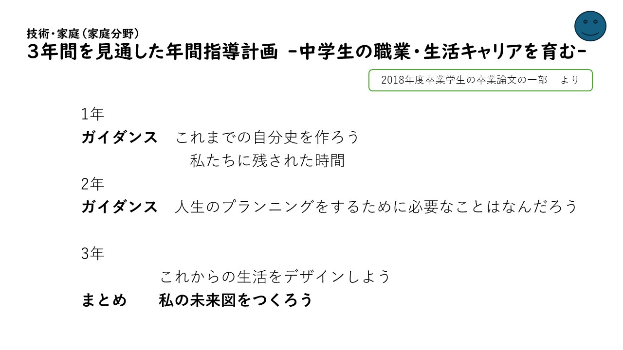 次に、中学校の年間カリキュラムです。中学校の家庭科3年間分について、生活設計を柱にして、今から6年前に作成されたものですが、中学生の職業、生活キャリアを育む授業計画ということで、1年生の最初には、これまでの自分史を作ったり、私たちに残された時間について考えさせたりします。2年生で人生のプランニングをするために必要なことはどういうことなのかを考えさせ、3年生でこれからの生活をデザインします。そしてまとめとして、自分の未来図をつくるという内容になっています。中学校家庭科の学習指導要領に生活設計の項目はありませんが、人生100年時代を生きる中学生が、これからの家庭科の授業を通じて、自身の職業・生活キャリアを考えることは必要不可欠なことではないでしょうか。