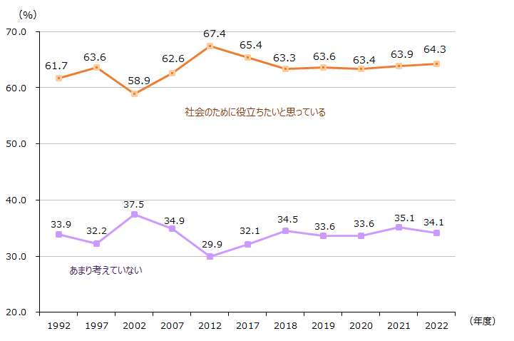 内閣府の「社会意識に関する世論調査」(令和6年10月調査)によると、「社会のために役立ちたい」と思っている人は63.6%で、前回調査(61.4%)と比べるとわずかに増加しています。