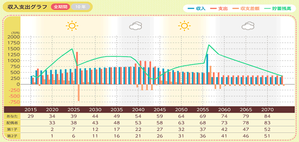 収入支出グラフ上に、セカンドライフにおいて資産が尽きる時期を表示しました。